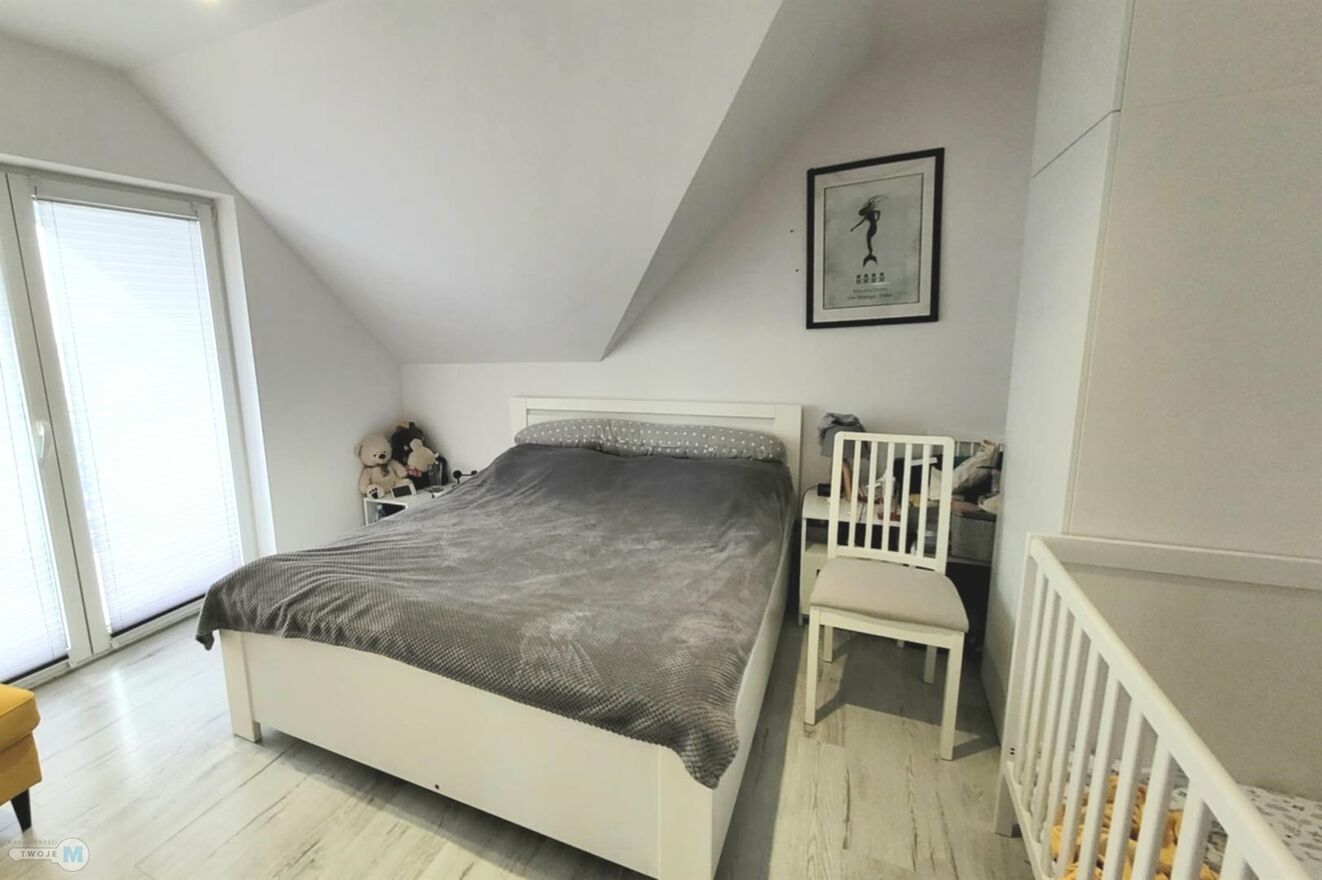 Parter składa się z wiatrołapu, kuchni, salonu z jadalnią z wyjściem na taras, łazienki. Kuchnia wyposażona jest w sprzęt AGD - lodówka, zmywarka, piekarnik, okap. Na poddasze mieszkalne prowadzą granitowe schody. Na piętrze mamy 3 osobne pokoje, w tym jeden z wyjściem na balkon, a także drugą łazienkę. Wszystkie pokoje są ustawne i nasłonecznione. Na ścianach zastosowano gładzie, na podłodze w całym domu panele winylowe. W domu zamontowano wysokiej jakości okna 4 szybowe Rehau, chrakteryzujące się wysoką termoizolacyjnością i szczelnością. Cały dom jest podpiwniczony - tu znajduje się pralnia i kotłownia.